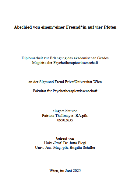 Durch meinen starken Bezug zu Tieren entstand die Idee für meine Magisterarbeit. Seit meiner Kindheit üben Tiere auf mich eine große Faszination aus. Die Trauer, ein zentrales Thema in der Psychotherapie, und die Leidenschaft zu Tieren haben mich dazu bewegt, mich mit diesem Thema im Rahmen meiner Magisterarbeit noch näher auseinanderzusetzen.